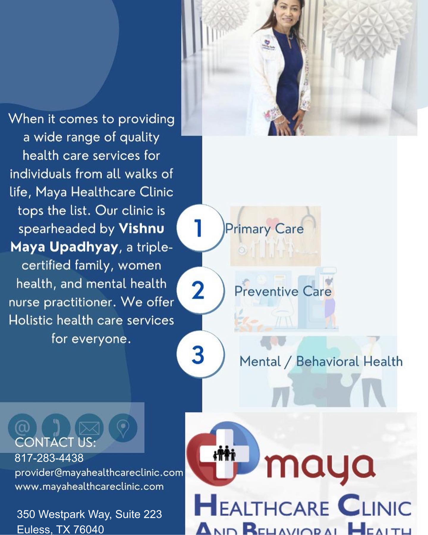 At Maya Health Care & Behavioral Health Clinic, we are dedicated to providing compassionate, holistic healthcare to our community. Under the leadership of our founder, Vishnu Maya Upadhyay, our team offers specialized care in women’s health, men’s health, primary care, and preventive services. We create personalized care plans to ensure effective treatment and address your unique health needs with professionalism and compassion.